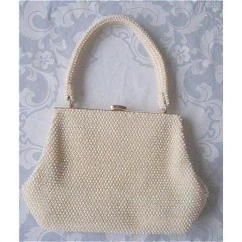 This is a gorgeous vintage beaded handbag, a genuine Corde Bead purse by Lumured. It is labeled inside Corde Bead by Lumured. It is on a bright and shiny gold tone frame and the fabric is covered in small and dainty ivory color beads The inside is absolutely clean with the exception of a tiny and very light stain close to the frame, which I have photographed. The interior is in an ivory color grosgrain rayon type fabric and there are two slip pockets and a zippered pocket, all on the far wall of the purse. Single demi handle has a height of 6-1/2" inches from the top of the frame. The purse measures 7-1/4" inches wide by 11" inches wide at the widest point. Perfect for day or evening wear.