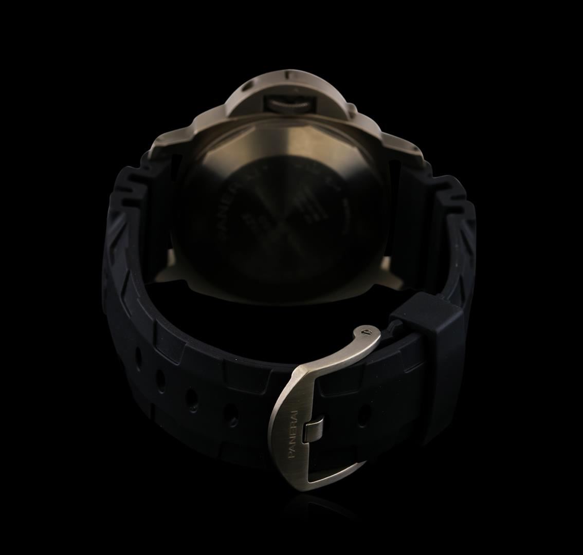 One Luminor Panerai Submersible Firenze watch featuring: Case: 52mm x 44mm, titanium, round. Dial: Textured black with Arabic numerals at 6 o'clock and 12 o'clock positions, pointed hands. Bracelet: Silicone/rubber with buckle. Movement: Automatic. Condition: No scratches on glass, very light wear on case and bracelet.