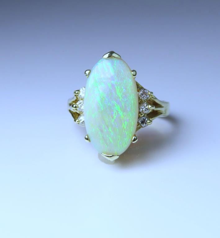 featuring an oval Opal weighing approx. 8.00 carats with flashes of green, blue and orange accented by 6 round cut side Diamonds set in 14 karat yellow gold setting, ring size 7. Retail $3,000-$4,000