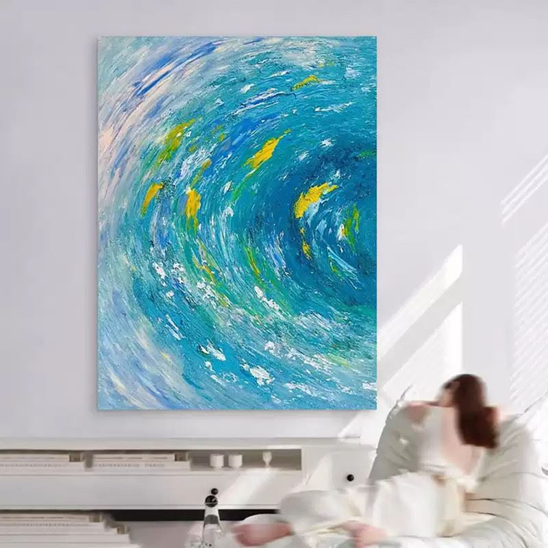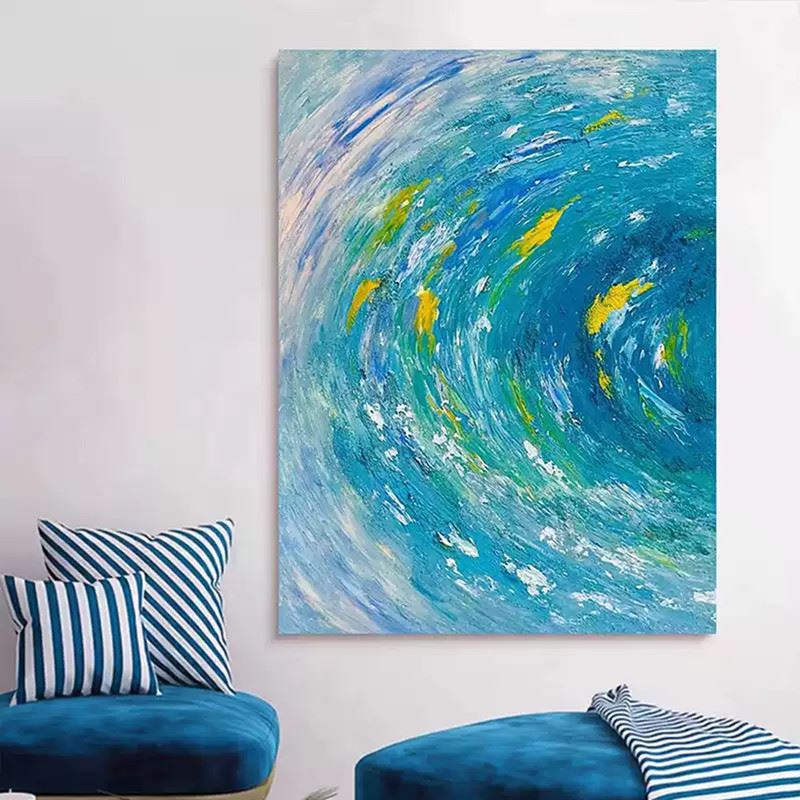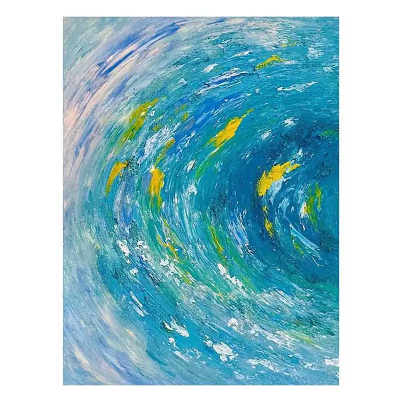 Blues and golds surge in a sweeping vortex, as if light itself were leading a silent, secret journey. Dimensions: 24 x 31 inches.