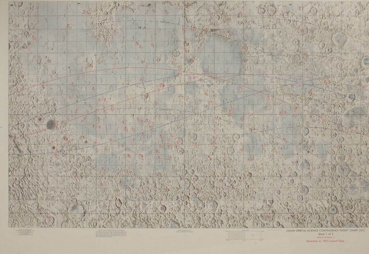 Exceptional pair of first edition Apollo 17 lunar orbital science contingency flight charts, sheets No. 1 and 2, both 41 x 28.25, dated September 29, 1972, displaying large and highly detailed expanses of lunar terrain and revolutions. Lithographed by DMAAC 11–72, and prepared and published by the Defense Mapping Agency Aerospace Center. Both are rolled and in fine condition.