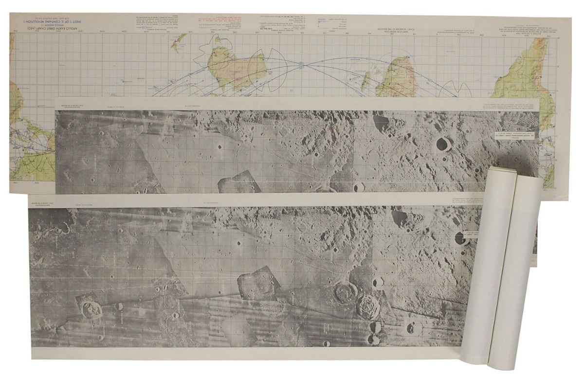 Four lunar charts: pair of first edition Apollo 11 lunar module ascent monitoring charts, sheets 3A and 3B, both 35.75 x 12.5, displaying landing site No. 2; a color first edition Apollo 11 earth orbit chart, sheet 1 of 3, 41.5 x 13.5, displaying revolution 1 and various tracking symbols; and a second edition of the Apollo 11 target of opportunity flight chart, issued as “SKB 32100097-301,” 58.25 x 14, noting various subsolar and subearth points and transient event areas. Lithographed by ACIC 6-69 and 7-69, and prepared under the direction of the Department of Defense by the Aeronautical Chart and Information Center. Rolled and in overall fine condition.