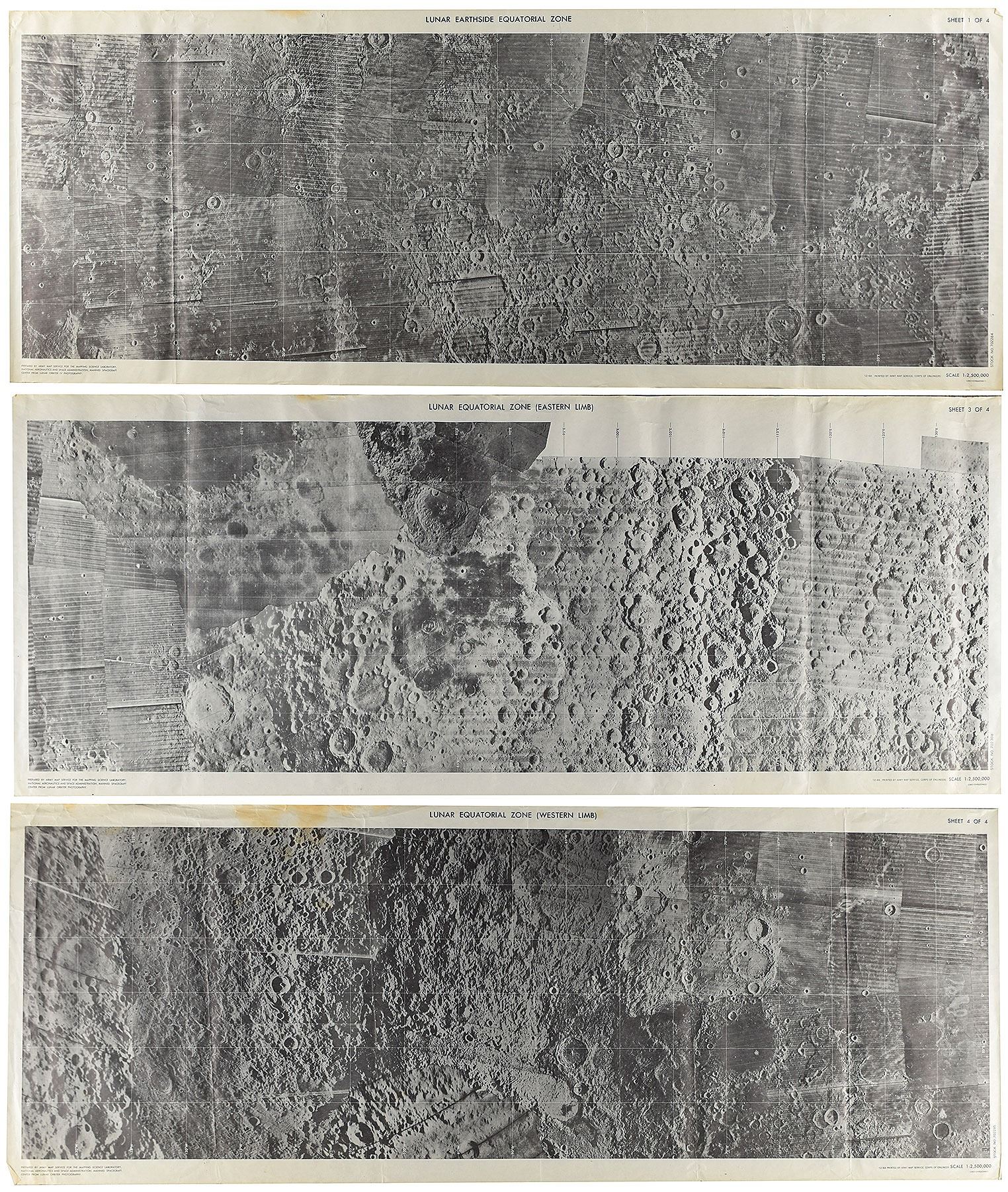 Scarce set of three Lunar Equatorial Zone charts, each scale 1:2,500,000, 38.25 x 14.5, dated December 1968, with charts featuring lunar terrain identified as ‘Earthside,’ sheet 1 of 4, ‘Eastern Limb,’ sheet 3 of 4, and ‘Western Limb,’ sheet 4 of 4. All maps were prepared by the Army Map Service for the Mapping Science Laboratory, NASA, Manned Spacecraft Center from Lunar Orbiter photography. Rolled and in overall very good to fine condition, with multiple vertical folds, and some staining and creasing to sheet four. From the personal collection of Paul Kruppenbacher, a member of the NASA Houston Landing and Recovery Division who trained Apollo astronauts in water recovery procedures and was deployed on U.S. Navy aircraft carriers for crew and spacecraft recovery operations.