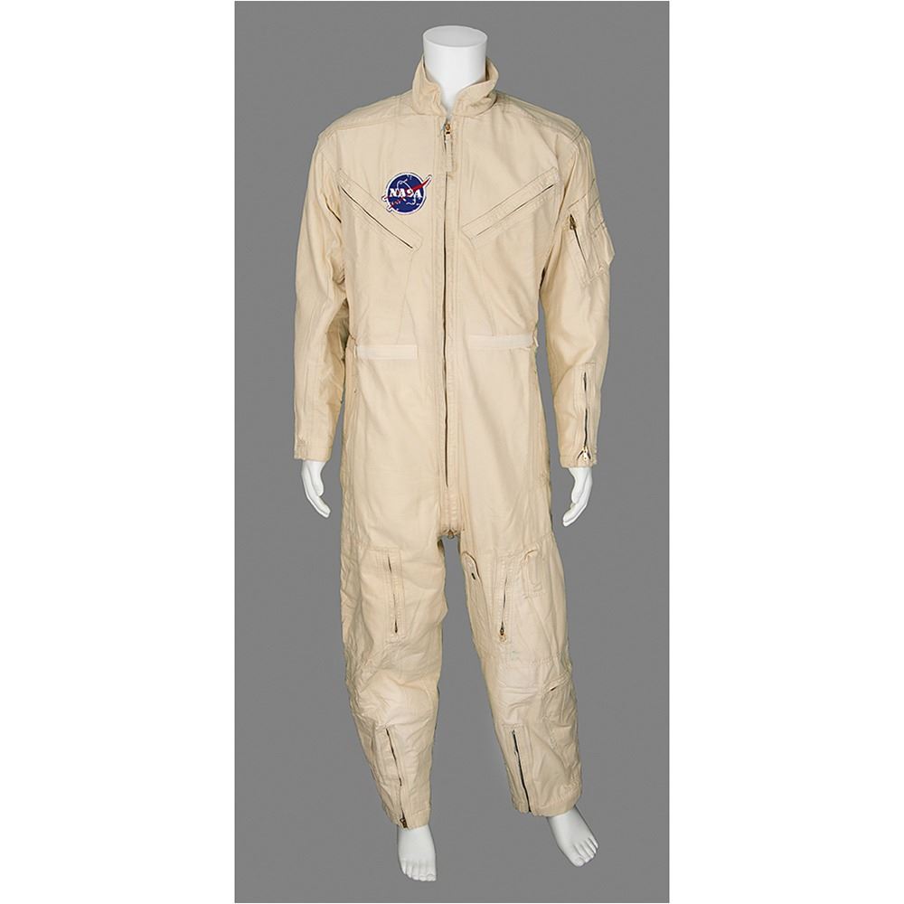The highlight of the collection is Kluever's NASA flight suit with embroidered 'meatball' emblem on the chest, manufactured by Flite Wear, constructed of white Nomex with frontal zipper from neck to crotch. The exterior features two diagonal zippered outer breast pockets, a shoulder-mounted pocket with holders for four writing utensils, two side pockets, two upper leg pockets, a snap-button pocket on upper left leg, and two lower leg pockets. The tag inside the collar reads: "Flite Wear by Land Mfg. Co., Wichita, Kansas, Flame Retardant," with white size tag, "Large Long." Includes two of Kluever's white Toptex helmets, both with transparent visors: one, marked "Kl[ue]ver" on the back, retains its MBU-5/P oxygen mask; the other is labeled "Lt. Col. Kluever" on the forehead. Both helmets include their green USAF padded bags.