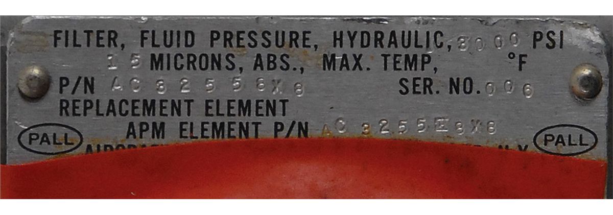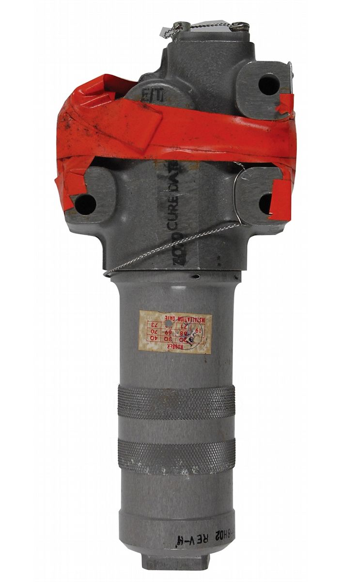 Lunar Module ground support Hydraulic Fluid Filter. Filter measures approximately 7? long, with a serial number engraved on one side and a Grumman manufacurer’s label affixed to another side which reads, “Filter, Fluid Pressure Hydraulic, P/N AC32558X8; Ser. No. 006.” Several layers of orange tape have been applied to the upper portion of the filter covering the outflow valve. Provenance: Charles Bell Estate.