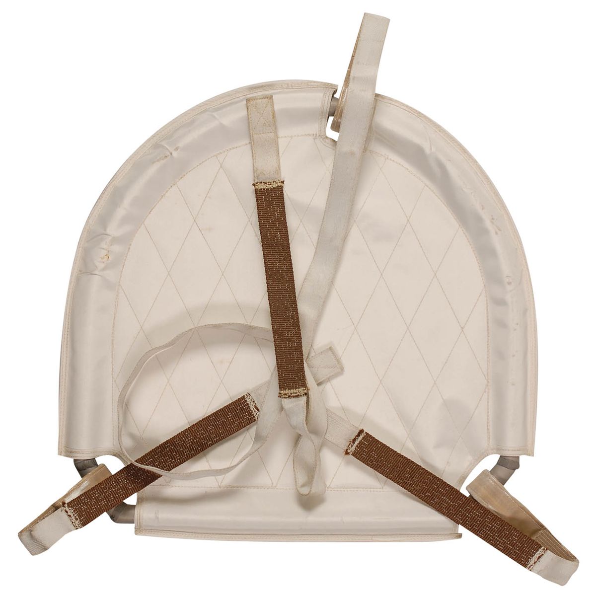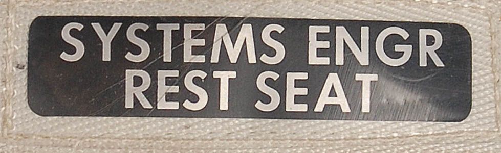 Rare and special seat made for use in the lunar module during ground tests. The seats were installed by attaching straps on the seats to fittings on the armrests in front, and a ceiling fitting on the back. Seat consists of a welded aluminum frame with Beta cloth seat and Teflon bottom edging, and three straps. The back strap bears the label, "SYSTEMS ENGR REST SEAT." This seat would be used on the right side for the LM Pilot. (LM technical documents often refer to the LM Pilot as the Systems Engineer, and this label reflects that usage). Grumman part number LDW340-28435-3 stamped in red on the seat bottom. In fine condition, with minor scuffing. Provenance: Charles Bell Estate.