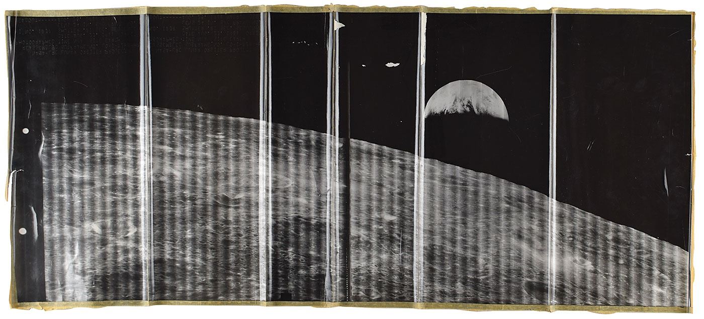 Uncommon transmission print of the surface of the moon taken from Lunar Orbiter 1 on August 23, 1966, consisting of six glossy photographic panels taped together on the reverse to an approximate overall size of 41˝ x 17.5˝. Rolled and in very good condition, with overall creasing, a tear to the left edge, old tape to border and reverse, areas of emulsion loss, and curling to vertical sides of each panel.