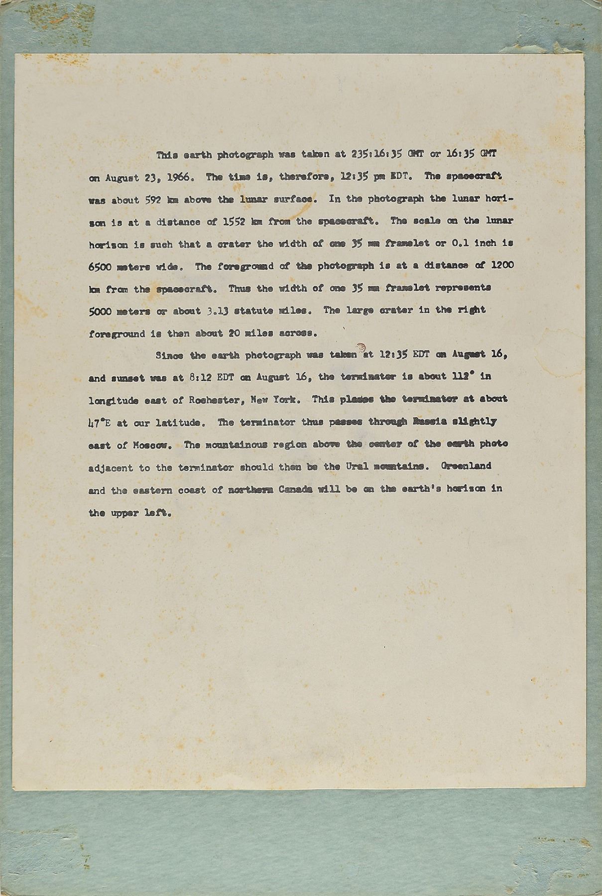 Historic original vintage glossy 9 x 13.5 silver gelatin photograph of the crescent Earth over the lunar surface, taken by Lunar Orbiter 1 on August 23, 1966. Affixed to a same-size mount. A detailed, technical caption is affixed on the reverse, in part: "This earth photograph was taken at 235:16:35 GMT or 16:35 GMT on August 23, 1966. The time is, therefore, 12:35 pm EDT. The spacecraft was about 592 km above the lunar surface. In the photograph the lunar horizon is at a distance of 1552 km from the spacecraft." In very good to fine condition, with minor dings and creasing to edges, a tiny surface chip to upper right corner, and subtle foxing to caption and reverse.