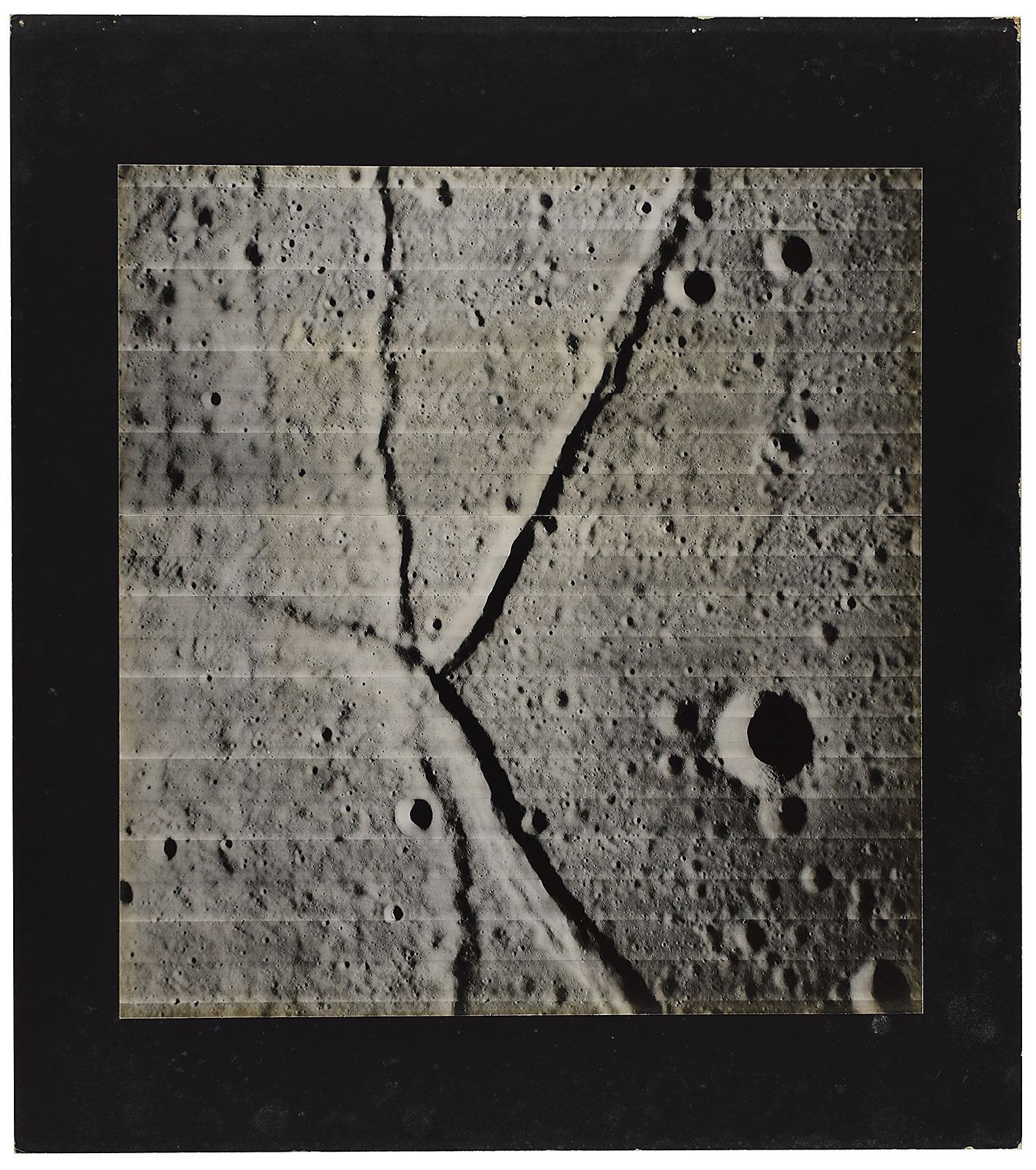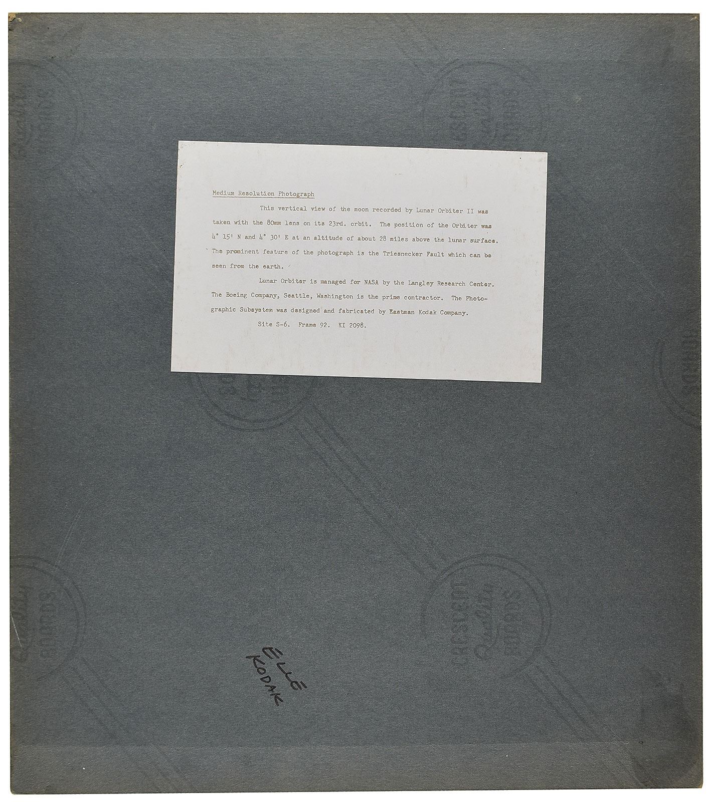 Detailed original vintage semi-glossy 12.75 x 13.5 silver gelatin photograph of the moon's surface taken by Lunar Orbiter 2 in November 1966, showing a wide-angle vertical view of the rilles near the Crater Triesnecker in the Sinus Medii. Affixed to a 16 x 18 mount, with a detailed affixed caption on the reverse, in part: "This vertical view of the moon recorded by Lunar Orbiter II was taken with the 80mm lens on its 23rd orbit. The position of the Orbiter was 4° 15' N and 4° 30' E at an altitude of about 28 miles above the lunar surface. The prominent feature of this photograph is the Triesnecker Fault which can be seen from the earth…Site S-6. Frame 92. KI 2098." Also annotated on the reverse in felt tip, "Elle, Kodak." In fine condition, with edgewear and slight soiling to the mount.