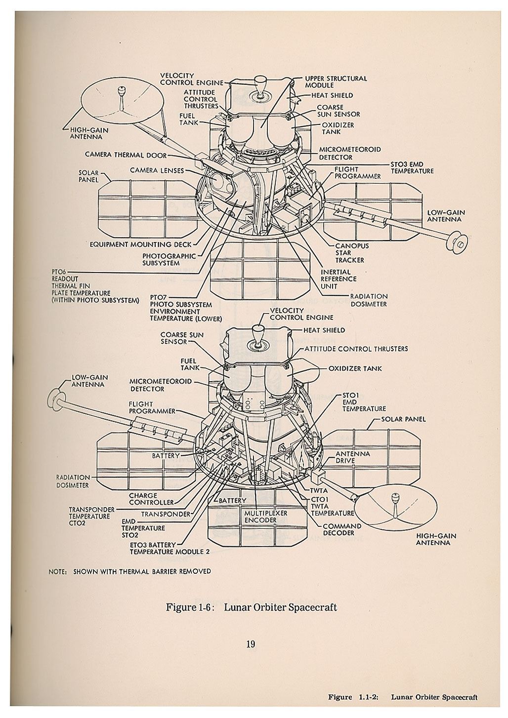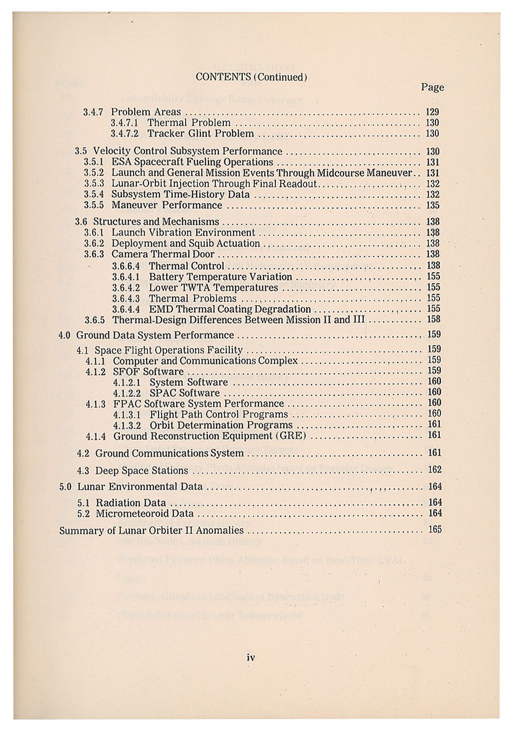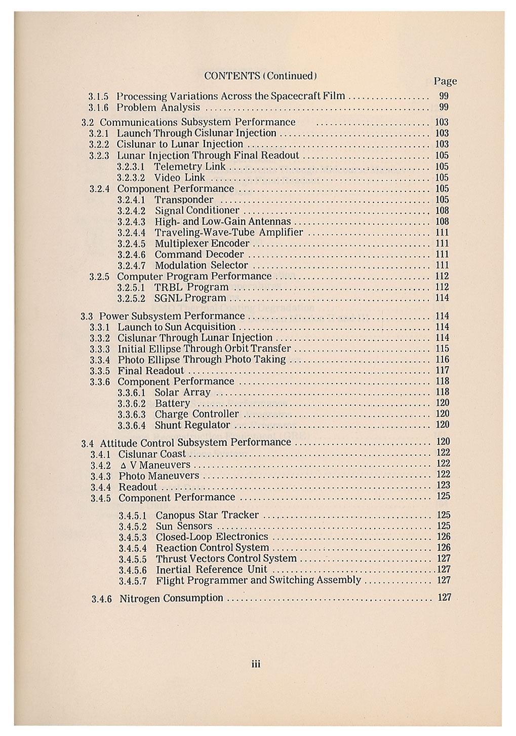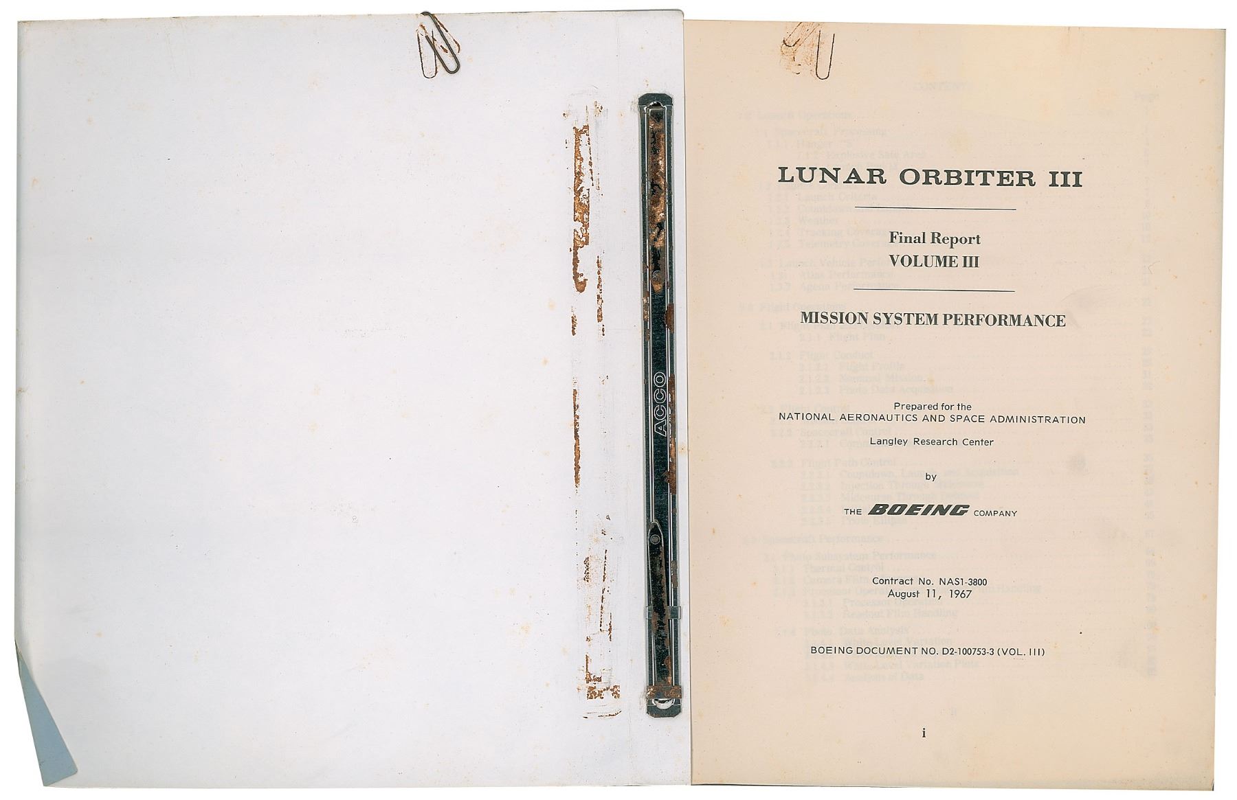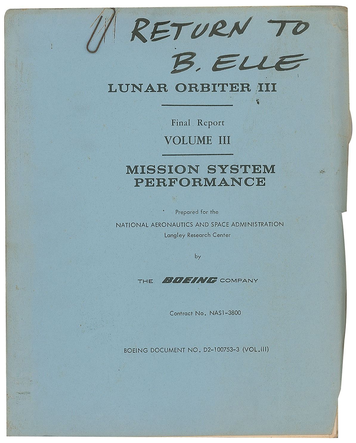 Bracket-bound report prepared for NASA by Boeing, entitled "Lunar Orbiter III: Final Report, Volume III: Mission System Performance" (Boeing Document No. D2-100753-3 (Vol. III)), 8.75 x 11.25, 167 pages, August 11, 1967. The comprehensive report contains numerous diagrams, and provides details and data concerning launch operations, flight operations, spacecraft performance, ground data systems performance, and lunar environmental data, including several pages about the photographic mission. The front cover is prominently annotated in felt tip, "Return to B. Elle." In very good to fine condition, with edgewear and a few rusty paperclip marks.
