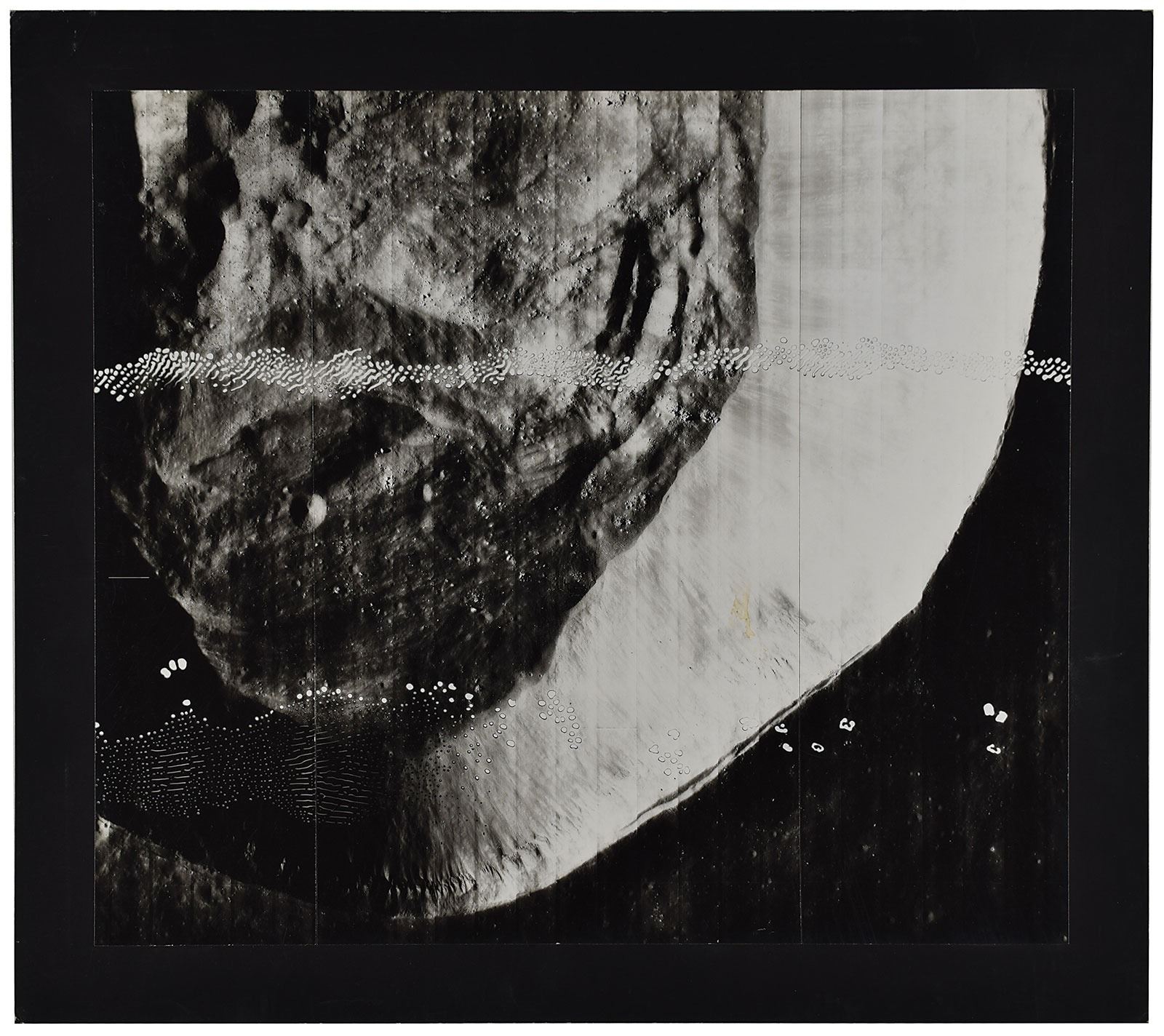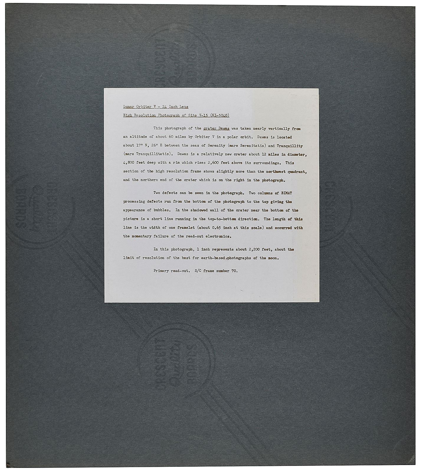 Original vintage semi-glossy 13.5 x 15.5 silver gelatin photograph of the moon's surface taken by Lunar Orbiter 5 in August 1967, showing a near-vertical view of Crater Dawes, revealing some film processing errors. Affixed to a 16 x 18 mount, with a typed caption on the reverse, in part: "Lunar Orbiter V - 24 Inch Lens, High Resolution Photograph of Site V-15 (KI-5040). This photograph of the crater Dawes was taken nearly vertically from an altitude of about 60 miles by Orbiter V in a polar orbit. Dawes is located about 17° N, 26° E between the seas of Serenity (mare Serenitatis) and Tranquility (mare Tranquillitatis). Dawes is a relatively new crater about 12 miles in diameter, 4,800 feet deep with a rim which rises 2,600 feet above its surroundings…Two defects can be seen in this photograph. Two columns of BIMAT processing defects run from the bottom of the photograph to the top giving the appearance of bubbles. In the shadowed wall of the crater near the bottom of the picture is a short line running in the top-to-bottom direction. The length of this line is the width of one framelet (about 0.65 inch at this scale) and occurred with the momentary failure of the read-out electronics. In this photograph, one inch represents about 2,200 feet, about the limit of resolution of the best for earth-based photographs of the moon. Primary read-out. S/C frame number 70." In fine condition, with a tiny stain to the image and a light crease to one corner of the mount.
