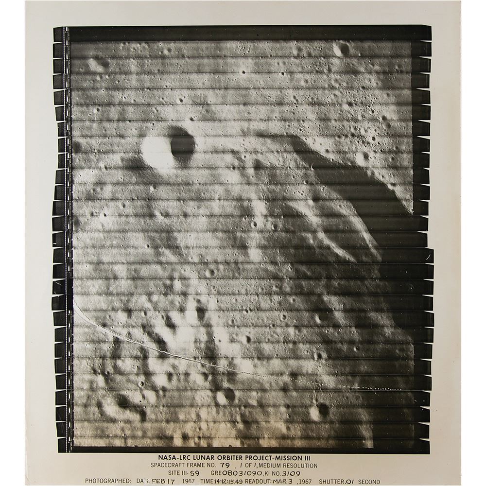 Original vintage glossy 20 x 22.25 silver gelatin photograph featuring imagery of the moon's cratered lunar terrain as taken by the Lunar Orbiter 3, with bottom legend reading: "NASA-LRC Lunar Orbiter Project-Mission III, Spacecraft Frame No. 79, 1 of 1, Medium Resolution, Site III-S9, GRE 08031090, KI NO. 3109, Photographed: Date: Feb 17 1967, Time: 14:12:15.49, Readout: Mar 3, 1967, Shutter .01 Second." In very good to fine condition, with scattered surface creases (mostly to borders), slight edge rippling, and some scuffing along the bottom.