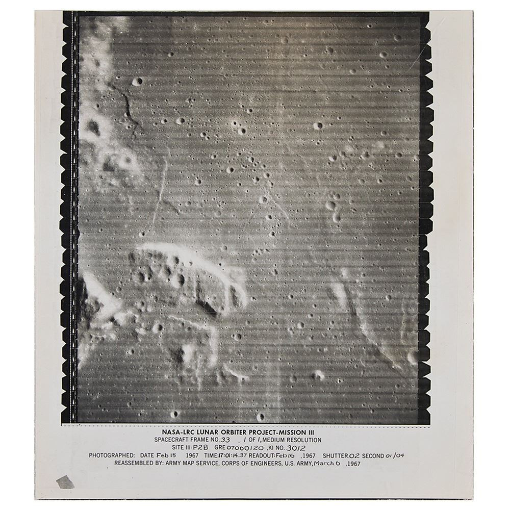 Original vintage glossy 20 x 22.25 silver gelatin photograph featuring imagery of the moon's cratered lunar terrain as taken by the Lunar Orbiter 3, with bottom legend reading: "NASA-LRC Lunar Orbiter Project-Mission III, Spacecraft Frame No. 33, 1 of 1, Medium Resolution, Site III-P2B, GRE 07060120, KI NO. 3012, Photographed: Date: Feb 15 1967, Time: 17:01:14.37, Readout: Feb 16, 1967, Shutter .02 Second 01/04, Reassembled by: Army Map Service, Corps of Engineers, U.S. Army, March 6, 1967." In very good to fine condition, with scattered creases (mostly to corners and borders) and slight edge rippling.