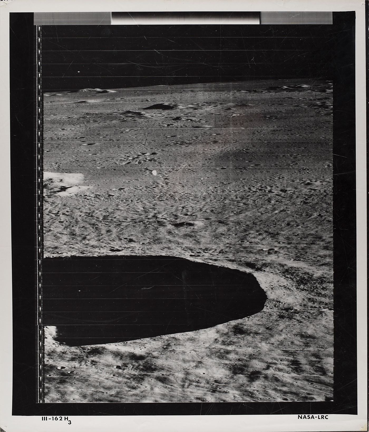 Original vintage glossy 20 x 24 silver gelatin photograph of the moon's surface taken by the Lunar Orbiter 3 spacecraft in February 1967, featuring a close-up of an oblique view of the lunar crater 'Kepler' in the near foreground. Marked in the lower border, "III-162H3" and "NASA-LRC." In very good to fine condition, with overall creasing, and tack holes to the corners. Consignor notes that this photograph was acquired while working at the Manned Spacecraft Center from 1972–1974.