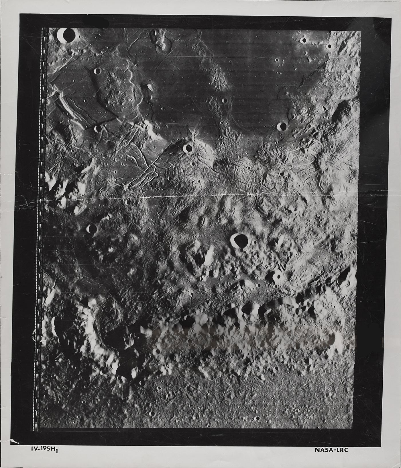 Original vintage glossy 20.25 x 24 silver gelatin photograph of the moon's surface taken by the Lunar Orbiter 4 spacecraft in May 1967, showing a close-up view with features including the Mare Orientale, the crater 'Shuleykin,' and Montes Rook. Marked in the lower border, "IV-195H1" and "NASA-LRC." In very good condition, with overall creasing, a heavy crease across the center, and tears to the left edge. Consignor notes that this photograph was acquired while working at the Manned Spacecraft Center from 1972–1974.