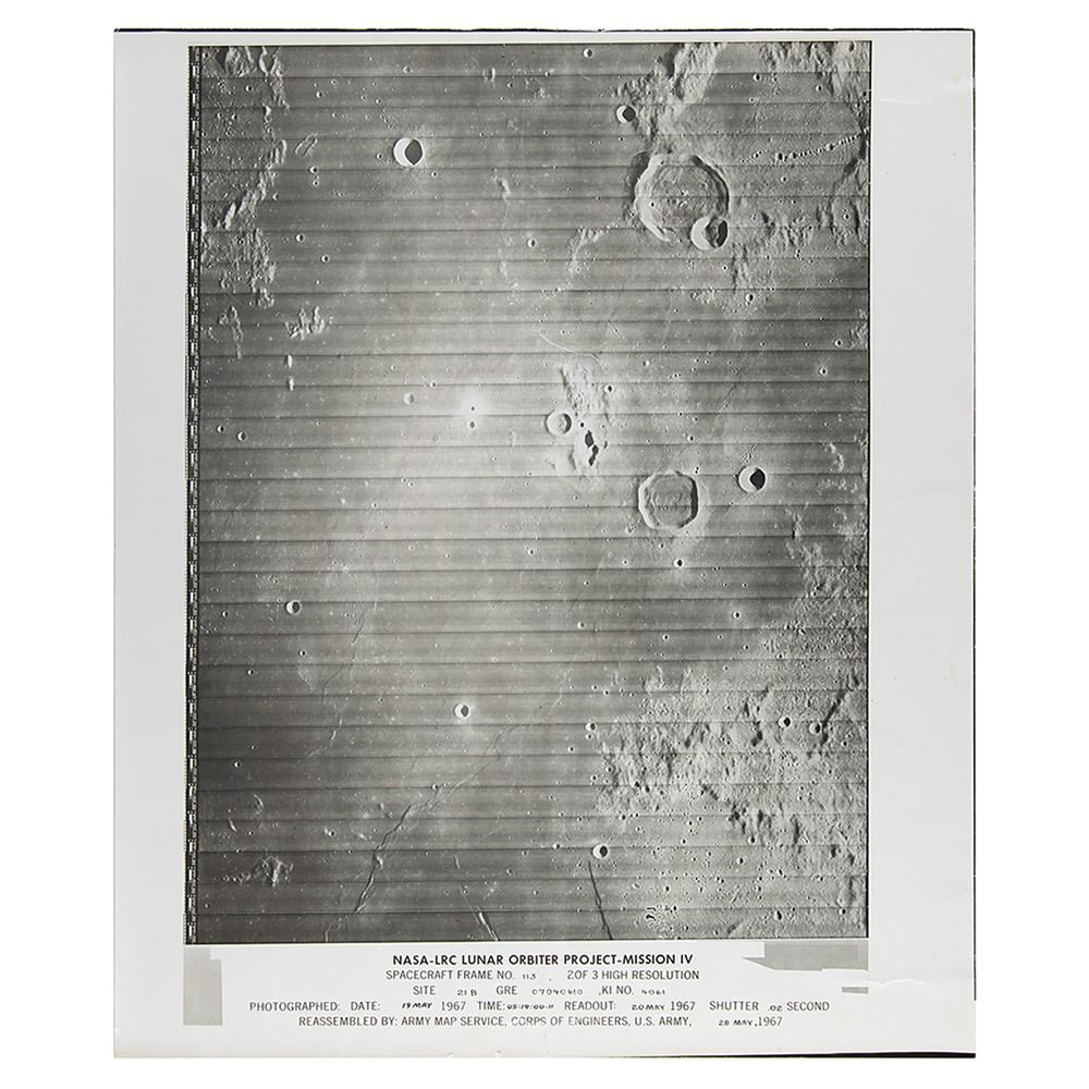 Scarce glossy 20 x 24 photographic poster made by the Marshall Space Center's Mapping Science Laboratory, which depicts imagery of the moon's cratered lunar terrain as taken by the Lunar Orbiter 4, with bottom legend reading: "NASA-LRC Lunar Orbiter Project-Mission IV, Spacecraft Frame No. 113, 2 of 3 High Resolution, Site 21 B, GRE 07040610, KI NO. 4061, Photographed: Date: 19 May 1967, Time: 05:19:00.11, Readout: 20 May 1967, Shutter .02 Second, Reassembled by: Army Map Service, Corps of Engineers, U.S. Army, 28 May, 1967." Reverse bears a MSC Houston Mapping Science Laboratory stamp. Tightly rolled and in very good to fine condition, with scattered creasing, heaviest to the right border, and a short tear to top edge.