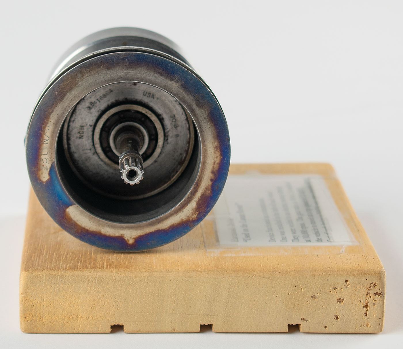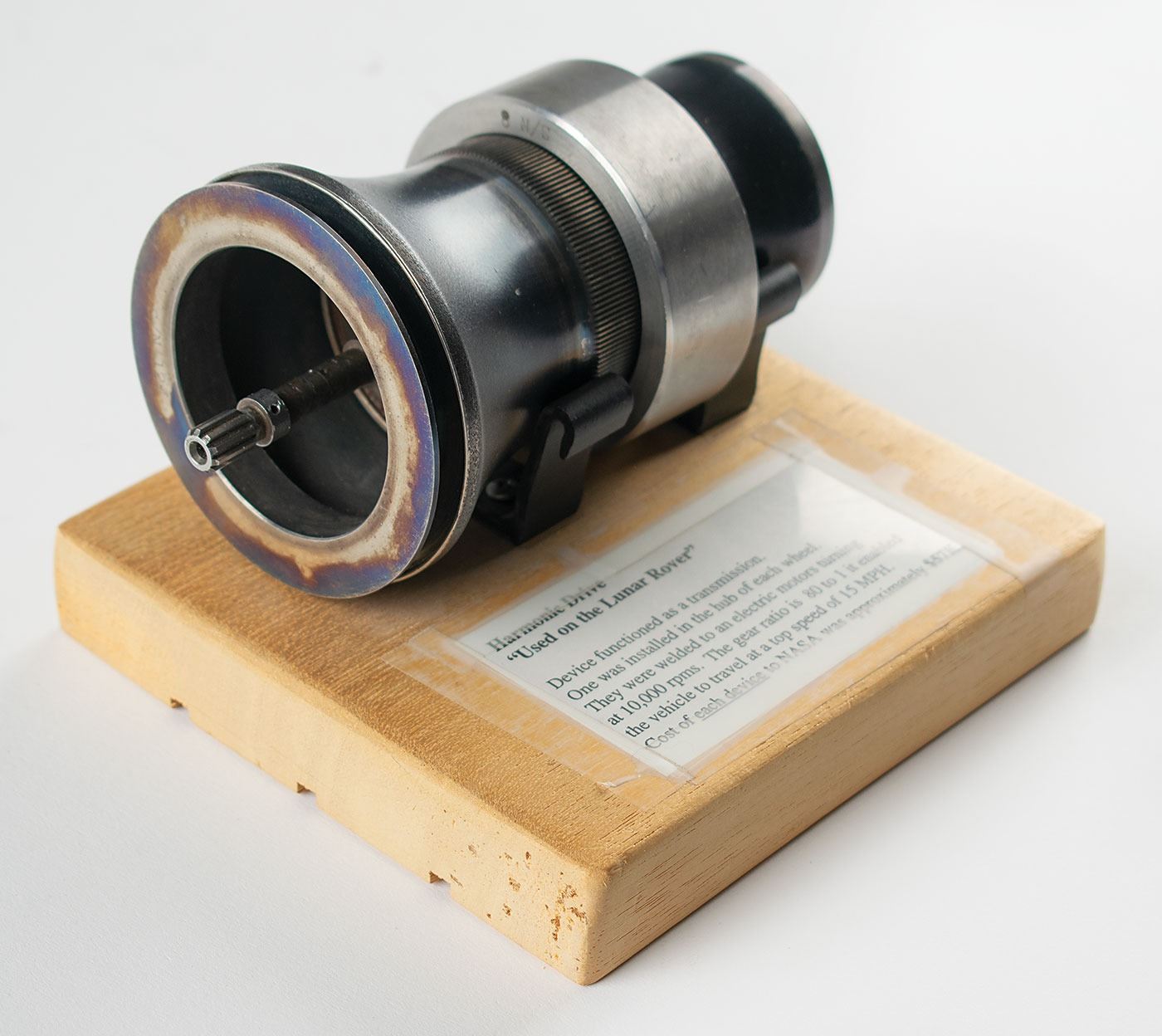 Harmonic drive unit designed for use on the Lunar Roving Vehicle (LRV), measuring approximately 5˝ x 3˝ x 3˝, with the toothed outer spline ring marked "734L649/B, S/N 8," and bearings on the internal shaft marked "NDH XB:16864 USA 70B 8" and "NDH XB-16864 USA 70B-17." The unit is displayed on a wooden stand with affixed description: "Harmonic Drive, 'Used on the Lunar Rover,' Device functioned as a transmission. One was installed in the hub of each wheel. They were welded to electric motors turning at 10,000 rpms. The gear ratio is 80 to 1, it enabled the vehicle to travel at a top speed of 15 MPH. Cost of each device to NASA was approximately $57K."