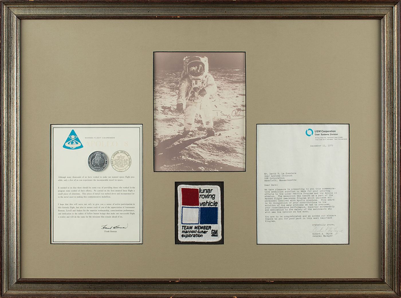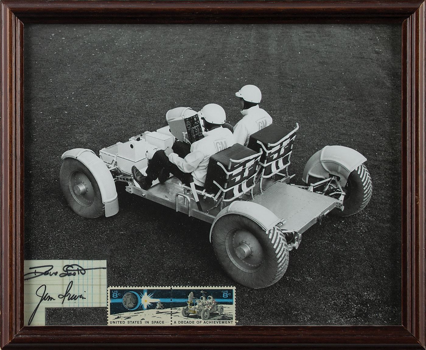 Includes several associated materials from the career of an engineer who worked on the project, highlighted by a framed 29.75˝ x 22˝ display featuring an original embroidered "Lunar Roving Vehicle Team Member" patch; an Apollo 8 medallion containing metals carried on the mission, affixed to its original presentation letter which bears Frank Borman's facsimile signature; a 1970 letter from the USM Corporation's Gear Systems Division presenting the Apollo 8 medallion in recognition of "untiring efforts to the Lunar Vehicle Program and the Apollo 15 mission"; and a photo of Buzz Aldrin, featuring a pre-printed signature. Additional materials include a gold-tone LRV lapel pin; a blank NASA-MSFC Lunar Roving Vehicle log book; two NASA Flight Awareness newsletters from April 1971; a print of an artist's rendering of the rover; a NASA "Critical Space Item" shipping label; a 1976 Kennedy Space Center sticker; a USAF "Offense by Defense" patch; and ink signatures of Apollo 15 moonwalkers Dave Scott and Jim Irwin taped to a glossy 10 x 8 photo of the Lunar Rover trainer. In overall very good to fine condition.