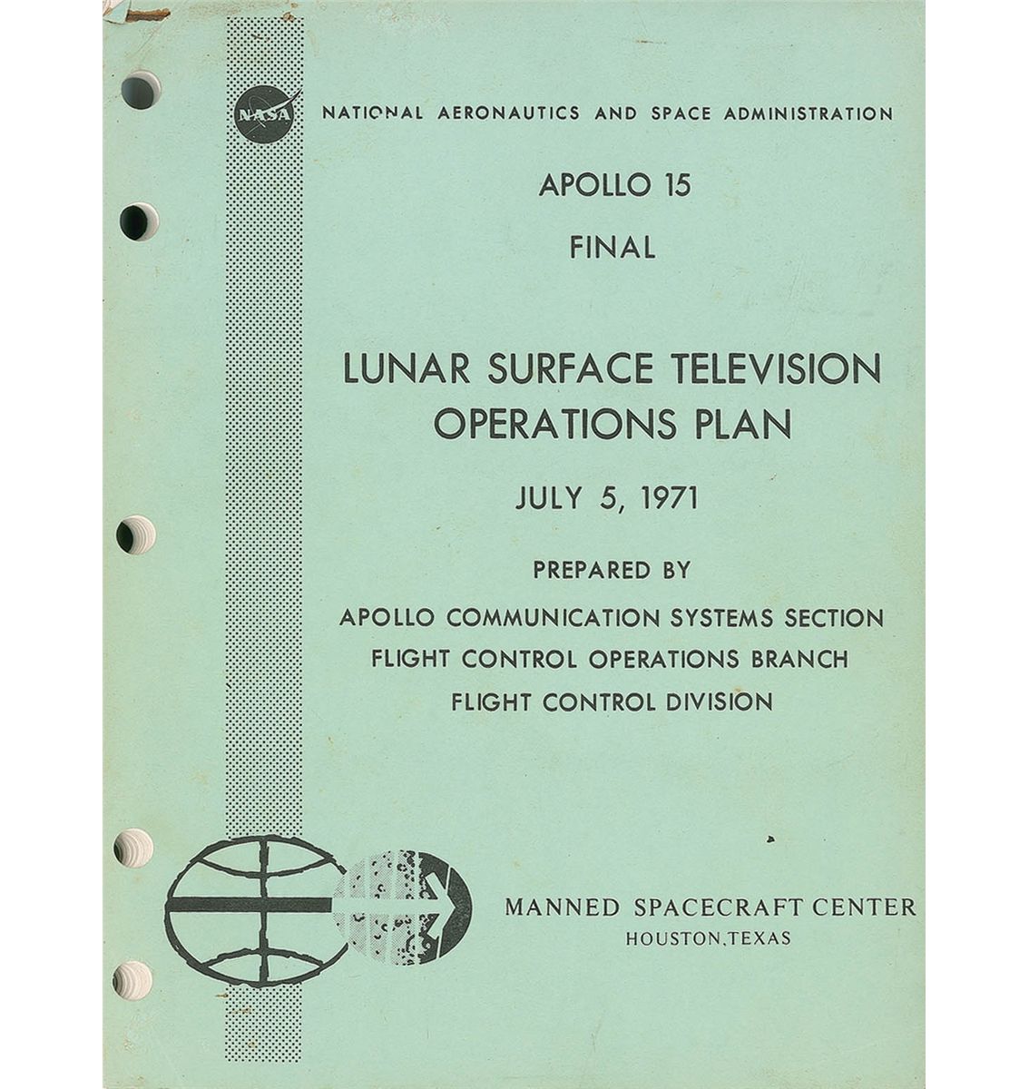 Final Apollo 15 Lunar Surface Television Operations Plan, 8 x 10.5, 57 pages, July 5, 1971. Document prepared by the Apollo Communication Systems Section of the Manned Spacecraft Center, including procedures, instructions for camera use, and timelines for television operations once on the lunar surface. In very good condition, with scattered creases, toning, and soiling to the covers, a couple small areas of trivial surface loss, a rusty binding staple to the upper left, and five punch holes to the left border.