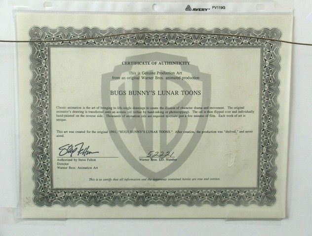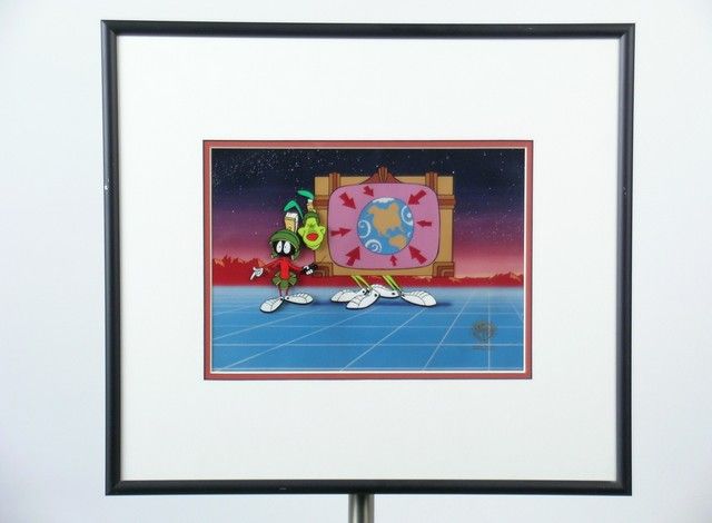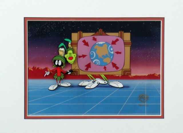 From the 1993 animation series "Lunar Tunes", this is an actual original production cel of "Marvin the Martian" and his trust dog-side kick "K-9". The background shows the Planet X landscape, and his observation screen with their targets: Earth. The cel has both Marvin and the head of "K-9" (his found sneakered legs can be scene behind the screen in the background art. This original cel comes with the official WB seal on the lower right hand corner and also includes a COA from Warner Brothers Animation Department. The cel is ID #52221. Cel is 12"x8.5" and the double-matted frame is 19"x17".