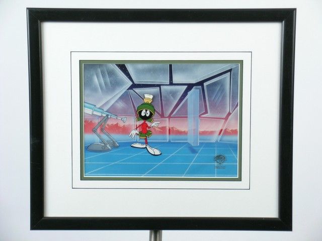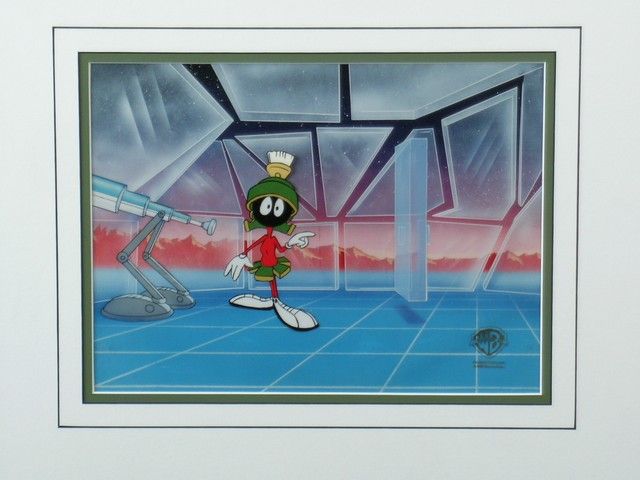 This is a beautifully rendered actual animation production cel from the 1991 series "Lunar Tunes". It shows Marvin the Martian in his futuristic glassed-in observation room on Planet X. The cel itself is of Marvin, with the original background. It includes the official WB seal in the lower right hand corner. This original cel is ID#66575, and includes a COA from Warner Brothers Animation Department. Original Cel & Background are 11.5"x8.5", and the double matted frame is 19/5"x16.5".