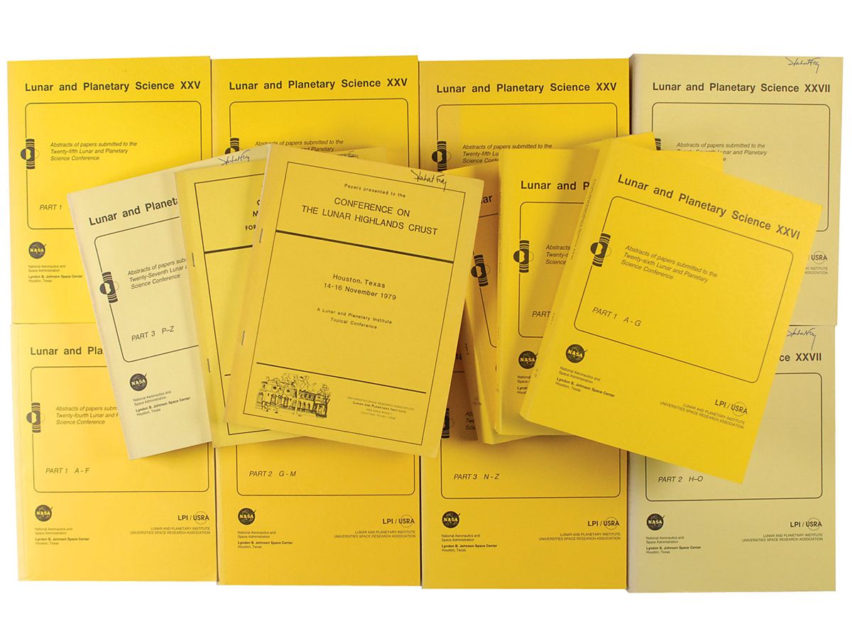 Collection of 14 volumes of Abstracts of Papers submitted to various Lunar and Planetary Science Conferences. Included are Conference XXIV (Part 1-3), XXV (Part 1-3), XXVI (Part 1-3), XXVII (Part 1-3), Conference on the Lunar Highlands Crust, and Conference on Multi-Ring Basins. In fine condition, with previous owner’s name written on several covers.