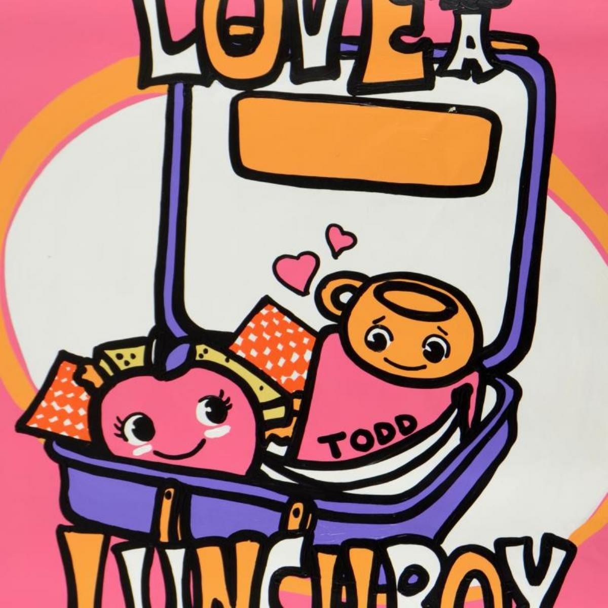 Lunch Box by Goldman Original. "Lunch Box" is an original acrylic painting on canvas by Todd Goldman, hand signed by the artist. Includes Certificate of Authenticity. Measures approx. 48" x 48" (image). ** Please note: The canvas may have minor imperfections (small scuffs or paint chipping) that are only noticeable upon close inspection. Also, there are minor creases that may be concealed when the piece is stretched. **