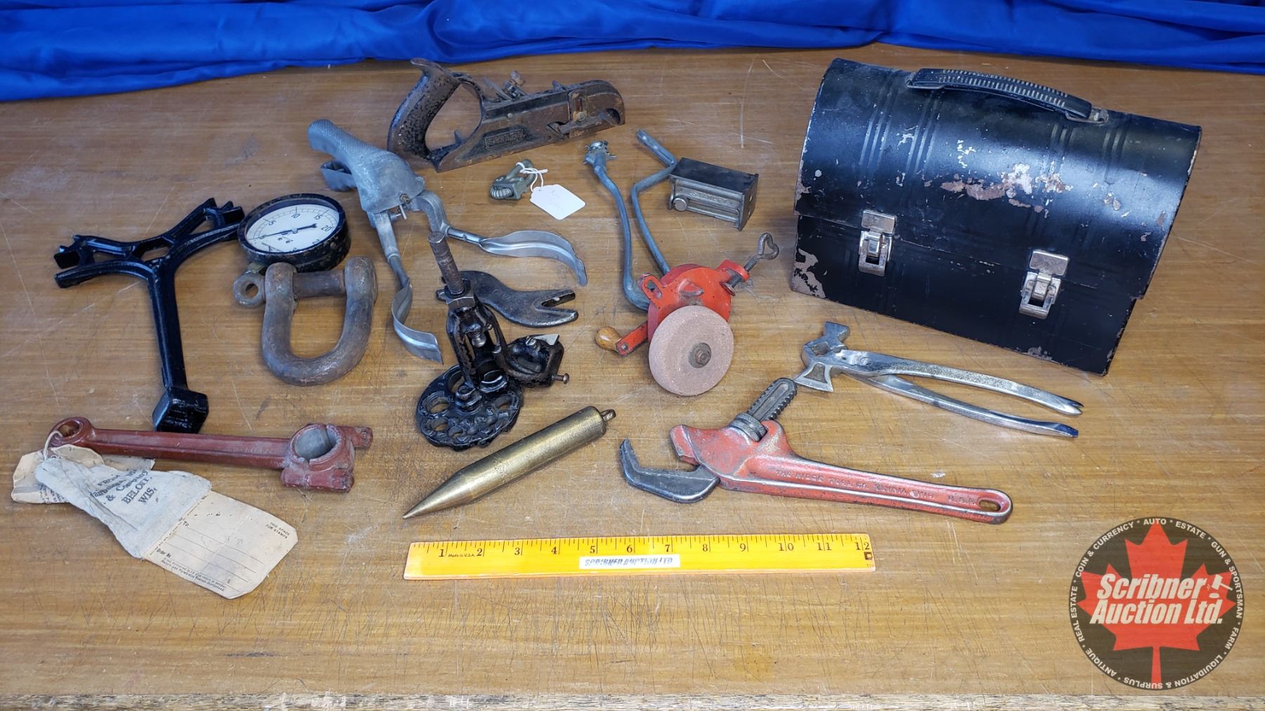 Lunch Box of Tools: Mini Grinding Wheel, Gauge, Specialty Tools, Brass Plumb Bob, Stearns Hollow Auger Tenon Buggy Spoke Cutter, etc) See Pics!