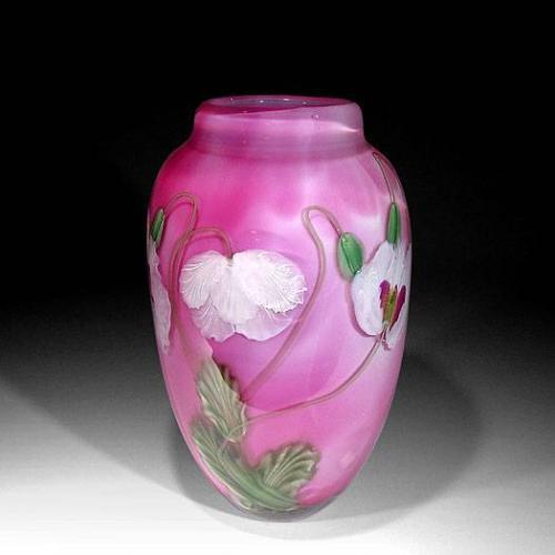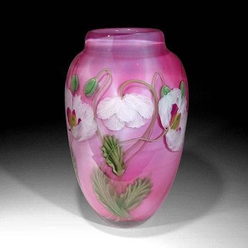 Lundberg Studios 2002 "White Opium Poppy" magnum vase, by Daniel Salazar. The piece has spaced, pink-centered white flowers, buds and green leaves, against a light pink background. This vase was made with the last of the pink/gold glass created by Jim Lundberg. Signed/dated. Height 9 1/2".