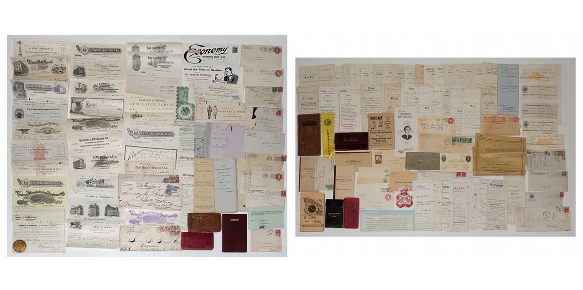 Over 100 pieces in this archive of Lundy B. Hogue. He may have served in the Civil War, 15th regiment, Ohio Infantry. Lot includes letters (many letters are from his brother, A. S. Hogue who traveled Europe and wrote of his travels and the history of places he visited), receipts, applications for patents, mining claims, powers of attorney, bank notes, film negatives souvenirs and more. Hogue was affiliated with the Yellow Bird Gold Mining Co., Yuma AZ; also with The Saticoy Orchard Co. in California. Hogue often made notes on the backs of checks, letters, envelopes, whatever was at hand. Stewart and Hogue were manufacturers of The Stewart Ignition Plug. Stewart and Hogue had several patents on auto engine parts.