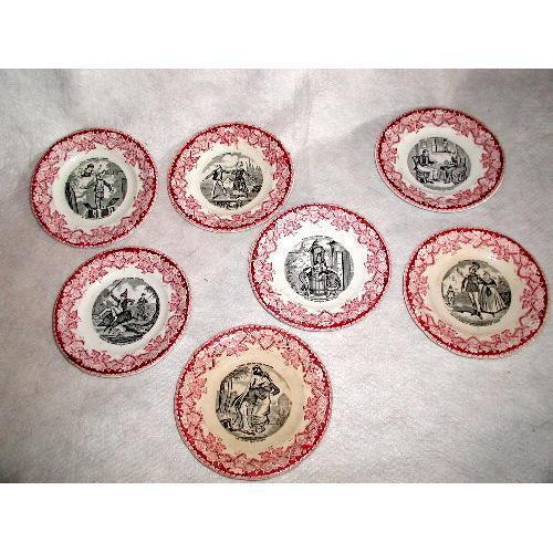 Set of 7 transferware rose,black and white plates from Luneville,France 19th century. Beautiful deep rose and pink floral design with grape leaf clusters serve as a border for each of the 7 different comical center depictions. From the "Scenes Villlageoises Comiques" series. Each have a saying in French beneath the picture. Five are marked on the back with the crown and wreath symbol and the wording "Opaque Luneville",2 are marked in black with "K & G Luneville". Two have very slightly darker white background in center. One small chip on edge of one plate,visible from the side only. Otherwise,no cracks or the like. Measure 7.5L X 7.5H X 7/8H.