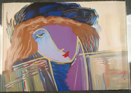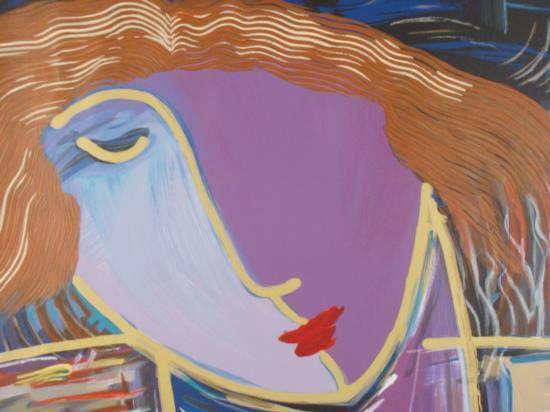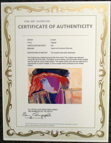 This print is by the artist Lunzen. The woman here is highly abstract, with hints of Picasso. You can also see Lunzen's multi media technique, originally done with pasted on gold patterned foil. The composition is quiet and reflective, and the colors dreamy. Artist: Lunzen Title: "Dignity" Medium: Silkscreen on paper Signature: Signed by the artist in gold paint pen, lower right Edition: Numbered 330/398 in gold paint pen, lower left; master screens have been destroyed Sheet size: 26 x 37 inches Condition: Excellent Certificate of Authenticity: From Fine Art Showcase This is a terrific portrait of a dignified woman, with fantastic colors that only Lunzen could do. Biography: