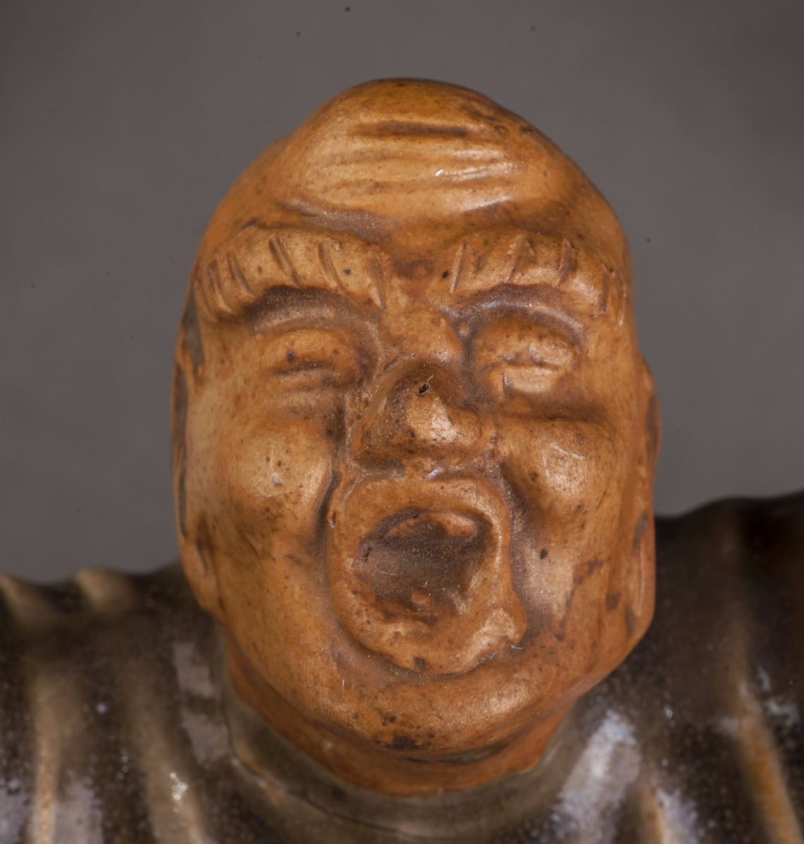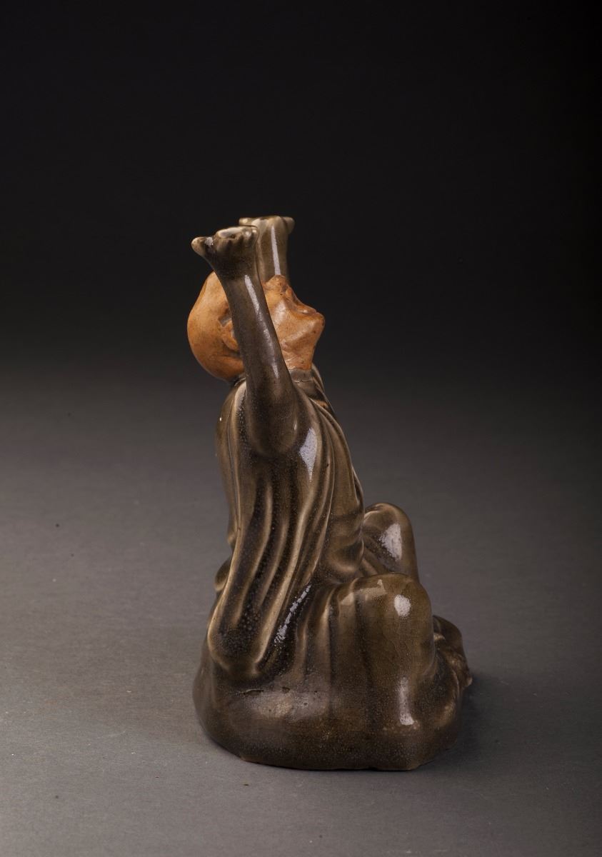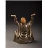 A vivid carved Luohan porcelain statue in good condition, the Luohan sitting with his two legs folded. And two arms opened and raised up. Face vividly expressed, with his mouth opened and the head slightly lookingup. Dressed in nice lobe.