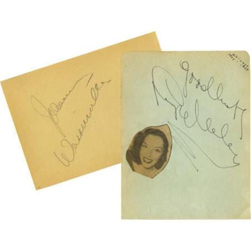 <B>Lupe Velez and Johnny Weissmuller Autographs.</B></I> A pair of autograph album pages signed by actors Weissmuller and Velez (former husband and wife) in pencil and black ink, respectively. In Very Fine condition with mild wear and tanning around the edges. <I>Accompanied by LOA from PSA/DNA.</B></I><BR><BR><b>Shipping:</b> Flat Material, Small (<a target="_blank" href="http://www.heritageauctions.com/common/shipping.php">view shipping information</a>)