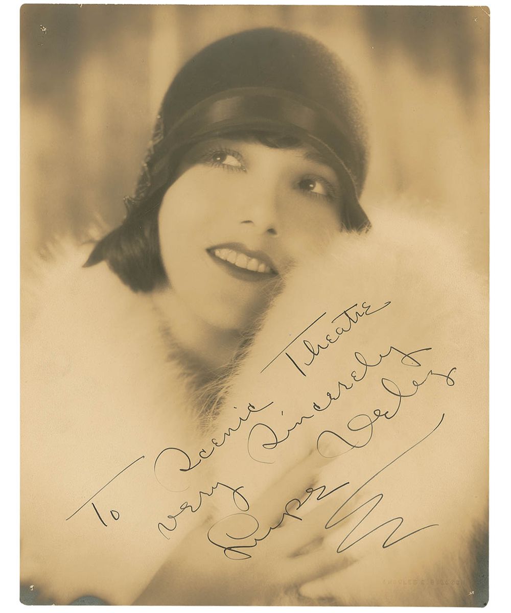 Glamorous vintage sepia matte-finish 10.25 x 13.25 portrait by Charles E. Bulloch, signed and inscribed in fountain pen “To Scenic Theatre, very sincerely, Lupe Velez.” In very good condition, with trimmed edges, tack holes to each corner, and some silvering to dark areas of the image.
