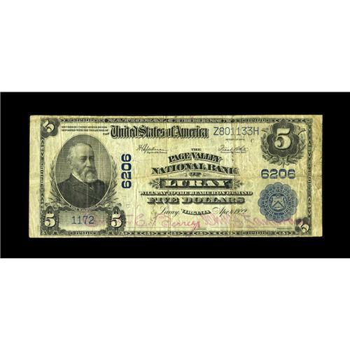 <B>Luray, VA</B></I> - $5 1902 Plain Back Fr. 609 <B>The Page Valley NB</B></I> Ch. # 6206<BR>This is only the third large known for this Page County issuer. Vivid pink stamped signatures still grace the surface of this <B>Fine</B></I> example that exhibits hard folds on the back.