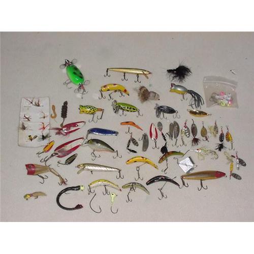 60 Lures, all types, most have been used. None are wood, some of the metal ones have rust but they are all in pretty good condition.