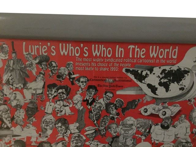 Lurie's Who's Who In The World framed poster. The most widely syndicated political cartoonist in the world presents his choice of the people most likely to shape 1993 .This is a special limited edition for Cartoon News International and The New York Times Syndicates. Signed in the top right by Lurie. (39"x28"). Framed in glass.
