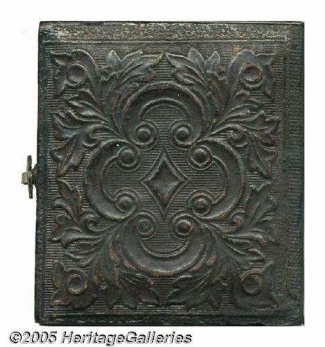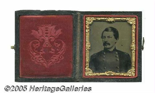 <B>Luscious McClellan Tintype in Original Case</B></I> Not to be confused with the familiar Abbott item which has a larger image facing in the opposite direction. One tiny black speck in the field is noted for accuracy, otherwise box and leather-like embossed case are in choice condition. A beautiful display piece for a tough candidate. 3.5" x 2" when displayed open; tintype itself is 1.375" x 1.625". Lot:258