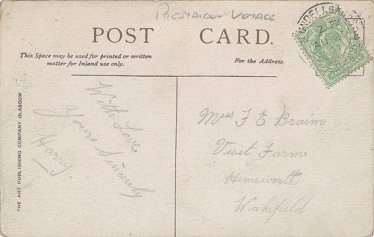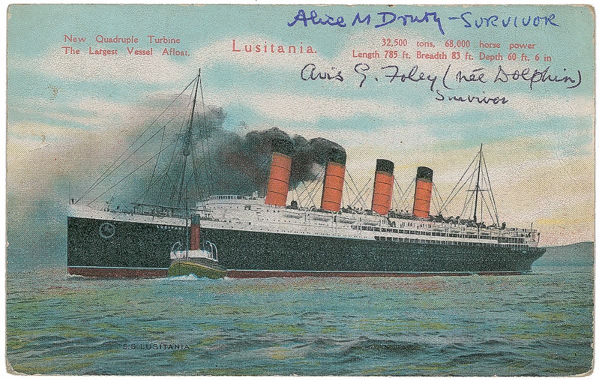 Color postcard depicting the RMS Lusitania, 5.5 x 3.5, signed in the upper right in blue ink by two survivors of the sinking of the ocean liner, “Alice M. Drury—survivor,” and in black ballpoint, “Avis G. Foley (nee Dolphin) survivor.” In fine condition. The Lusitania was sunk by a German U-boat on May 7, 1915, resulting in the deaths of 1,198 passengers and crew.