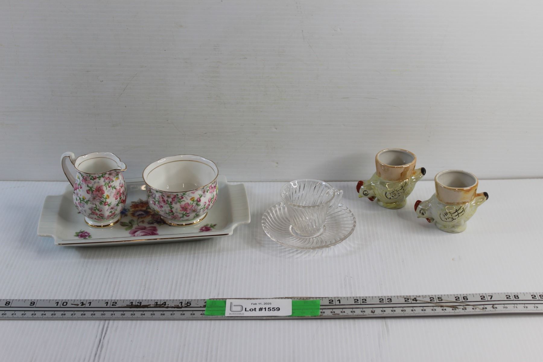 Luster Ware Egg Cups, Espresso Cup & Saucer and Cream & Sugar Set with Serving Tray