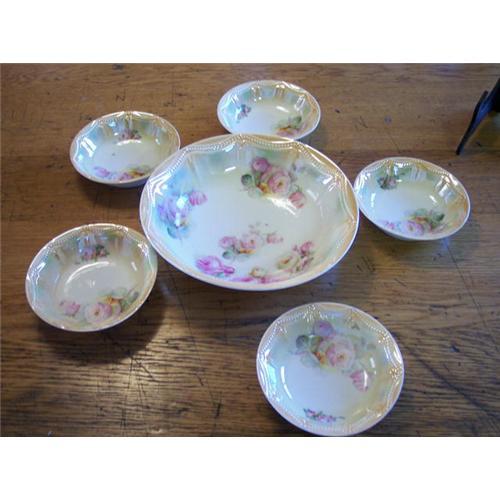 Very pretty berry set in Lusterware finish.Lots of pretty roses.In the last picture you can see a tiny chip on the bottom of one of the small bowels.There is also a tiny fleabite on the under edge of another small bowl and another one of the small bowls has been painted on one small spot due to I would say a flake .Small bowls measure 5 1/4" across and the large bowl is 9 ".