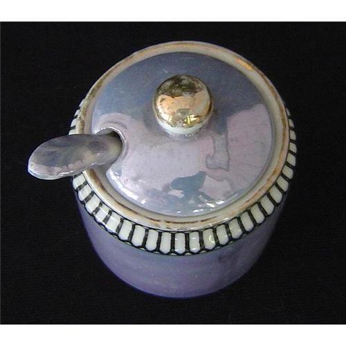 Japanese. Handpainted Gold leaf and black, with original spoon. Marked "Japan" Serve mustard, ketchup, preserves, etc. Gold leaf slightly worn, otherwise in excellent original condition