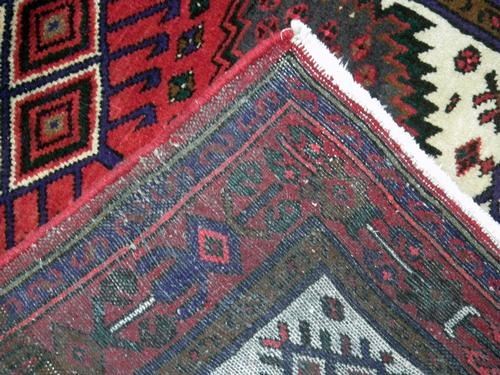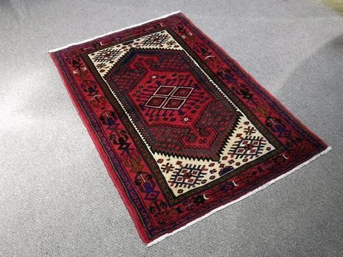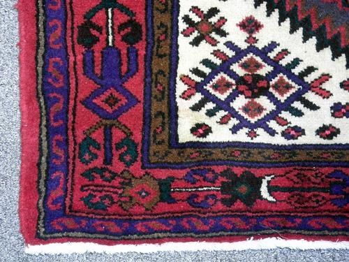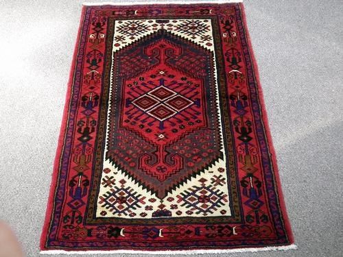 Fascinating handmade high quality Hamedan rug. It's made of fine quality lamb's wool pile on cotton foundation using all natural vegetable dye. A unique design of this rug shows off the genius of its waver. In this piece, the waver has use the two major color theme with white, rich red. Other colors also have been used to accompany the major theme to give this rug a unique geometrical design. This rug is a made from finest material to create an outstanding design. Size 5 x 3.4 feet.