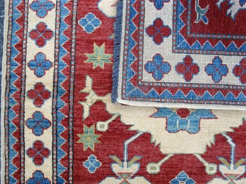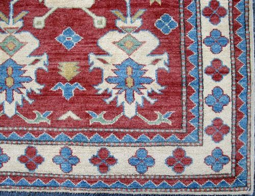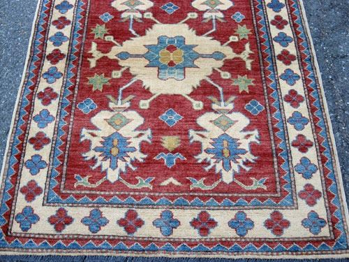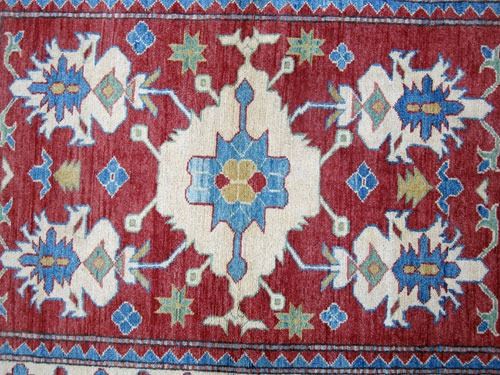 Lustrous and enchanting fine quality Karabak rug. 100% natural hand woven, vegetable dye, softest glowing baby lamb's wool pile on cotton foundation. This is a rare and unusual Karabak rug due to the fact that it combines geometric with floral design. Karabak in general employ geometric design only. on the same note, please notice the four flowers shooting off the central medallion that also resemble the stylized crab design. The contrasting colors of the medallion, background field and the border are so artistically executed that this rug is instantaneously captivating. Size: 5 feet X 3 feet 7 inches. Country of origin: Karabak.