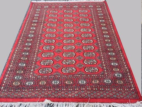 Lustrous fine super quality handmade Bokhara Rug. Made of all natural, vegetable dye, hand woven, softest worsted wool pile on cotton foundation. This beautiful Bokhara has wool pile so soft that it feels like velvet to the touch. Please notice the extra skirt at both ends, celebrating the start and finish of the weaving process. Creases are due to fold and not a defect. It is noteworthy that the production of Bokhara rugs have dwindled substantially in the past couple of years and therefore effecting their availability in the marketplace, making them subsequently more desirable and sought after. Creases are due to fold and not a defect. Size: 6 feet X 4 feet 2 inches. Country of Origin: Pakistan.