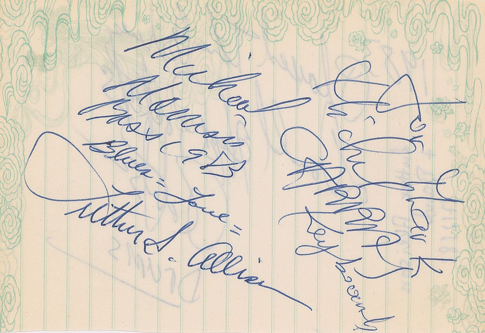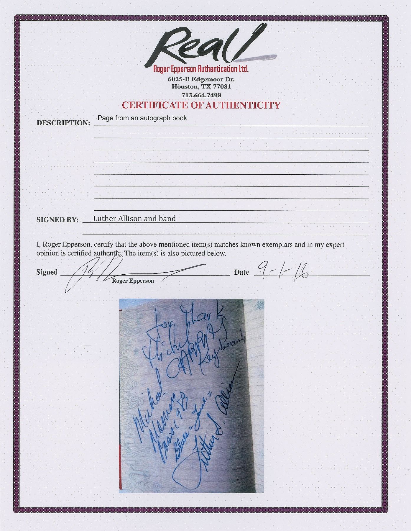 Ballpoint signatures, "Blues = Love = Luther S. Allison," "Michael Morrison, Bass 1983," and "Michael Carras, Keyboards," who adds an inscription "For Mark,” on an off-white 4 x 6 sheet; reverse signed by drummer Donald 'Hye Pockets' Robertson. In fine condition. Accompanied by a full letter of authenticity from REAL.