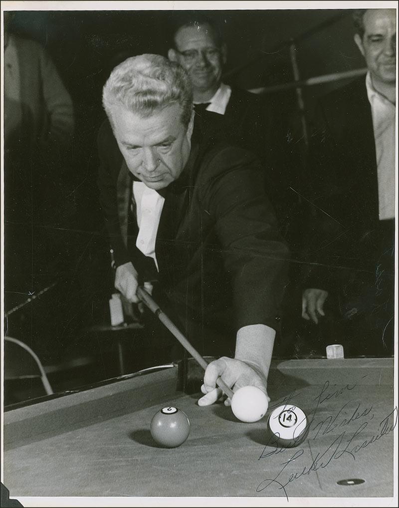 Six-time world championship billiards player (1918-1988) most well-known for his wizardry in the game of nine-ball at which he is widely considered one of the greatest players in history. Vintage glossy 8 x 10 photo of Lassiter shooting pool, signed and inscribed in black ballpoint “To Jim, best wishes, Luther Lassiter.” In very good condition, with several creases, mounting remnant to lower left corner, a bit of light silvering, and surface impressions from collector’s notations on reverse.