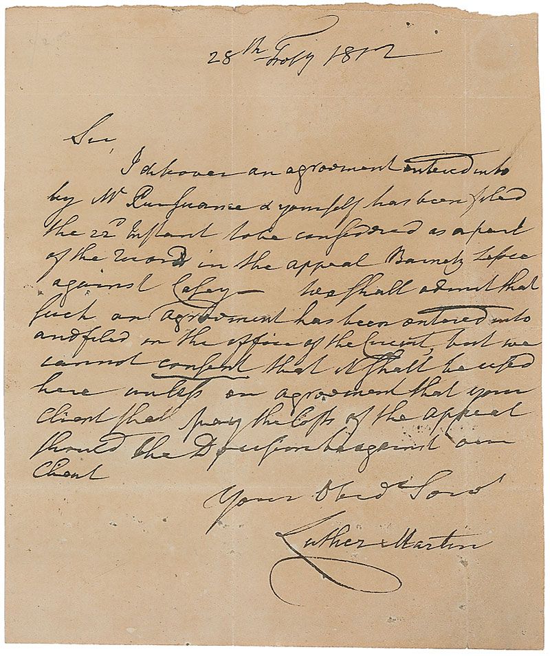 Politician and Founding Father (1748–1826) who refused to sign the Constitution on the grounds that it violated states’ rights. ALS, one page, 6.5 x 8, February 28, 1812. Letter to Robert G. Harper concerning “an agreement entered into…in the appeal Barnetz Lessee against Casey—he shall admit that such an agreement has been entered into and filed in the office of the Circuit, but we cannot consent that it shall be used here unless an agreement that your client shall pay the Cost of the appeal should the Decision be against our Client.” Reverse of second integral page bears an address panel in another hand. In very good condition, with intersecting folds, one through a single letter of signature and uniform toning.