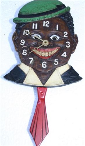 This small clock, approximately 3 ½" W x 5 ½" L with the pendulum necktie adding another 3" to length, has the form of a Black-faced character. The character’s eyes move with the movement of the pendulum. Some paint flaking underneath “knot” of tie. Keywind. Lux Mfg. Co., Inc., Waterbury, Conn. USA, D-90919, Pat.1928296.